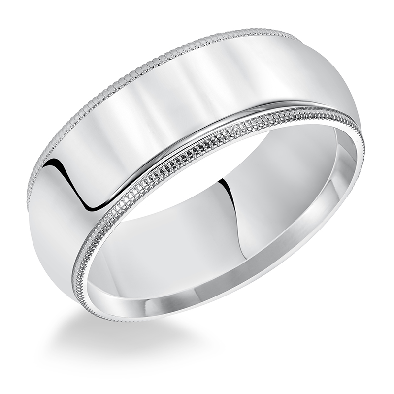 Mens white gold 7mm comfort-fit band with polished finish and millgrain edge.